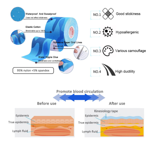 1. เทป Kinesiology Camo กันน้ำยืดหยุ่นระบายอากาศและเป็นมิตรกับผิวหนัง มันสามารถบรรเทาปัญหาอาการบวมและช่วยให้การไหลเวียนของน้ำเหลือง; เหมาะสำหรับทุกส่วนของร่างกายที่ใช้กับกีฬากายภาพบำบัดการลดน้ำหนักและสถานการณ์อื่น ๆ
